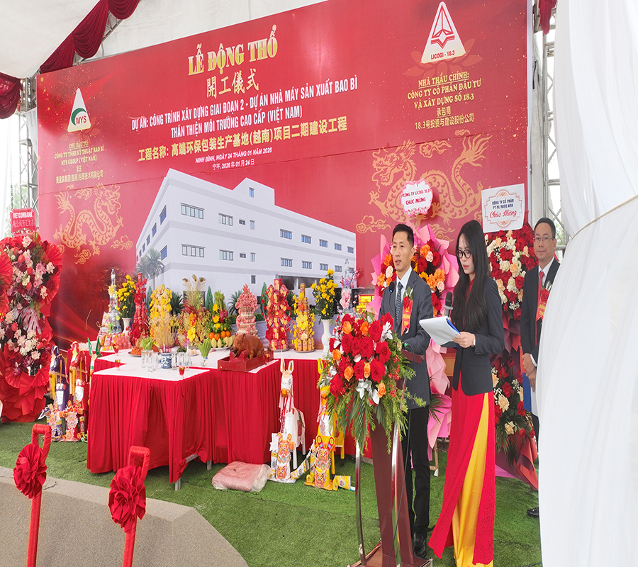 Phát biểu tại buổi Lễ,Ông: QUÁNG XẺO TUNG (公司总经理)-Tổng Giám Đốc Gửi lời cảm ơn sâu sắc tới Licogi 18.3 đã chuẩn bị chu đáo cho buổi khởi công được diễn ra trọn vẹn.Thành công từ giai đoạn I cùng kinh nghiệm nhiều năm xây dựng, ông chúc nhà thầu Licogi18.3 sớm hoàn thành và bàn giao dự án theo đúng tiến độ hợp đồng đã ký kết.